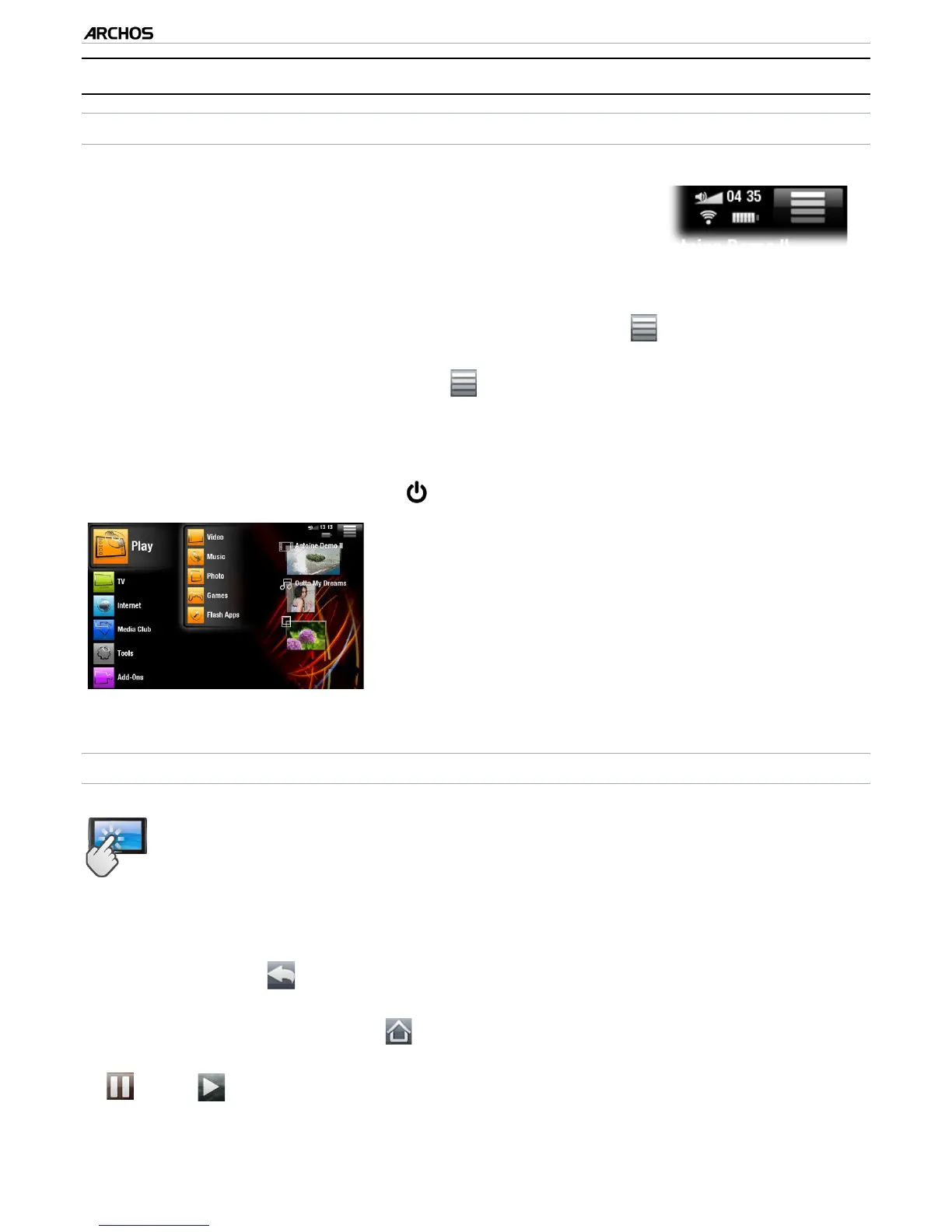 Your ARCHOS is equipped with a touchscreen. Below is a description of the