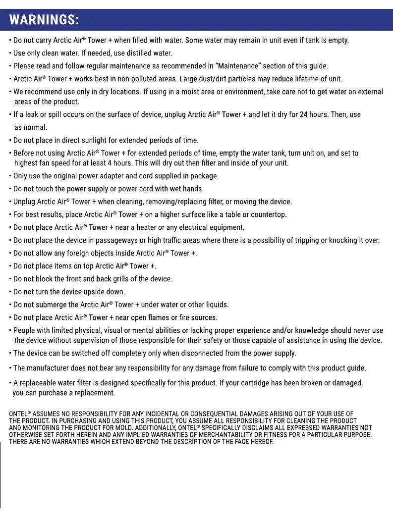 • If a leakor spill occurs on the surface of device,unplug Arctic Aire Tower+ and let it dry for 24 hours.Then,use