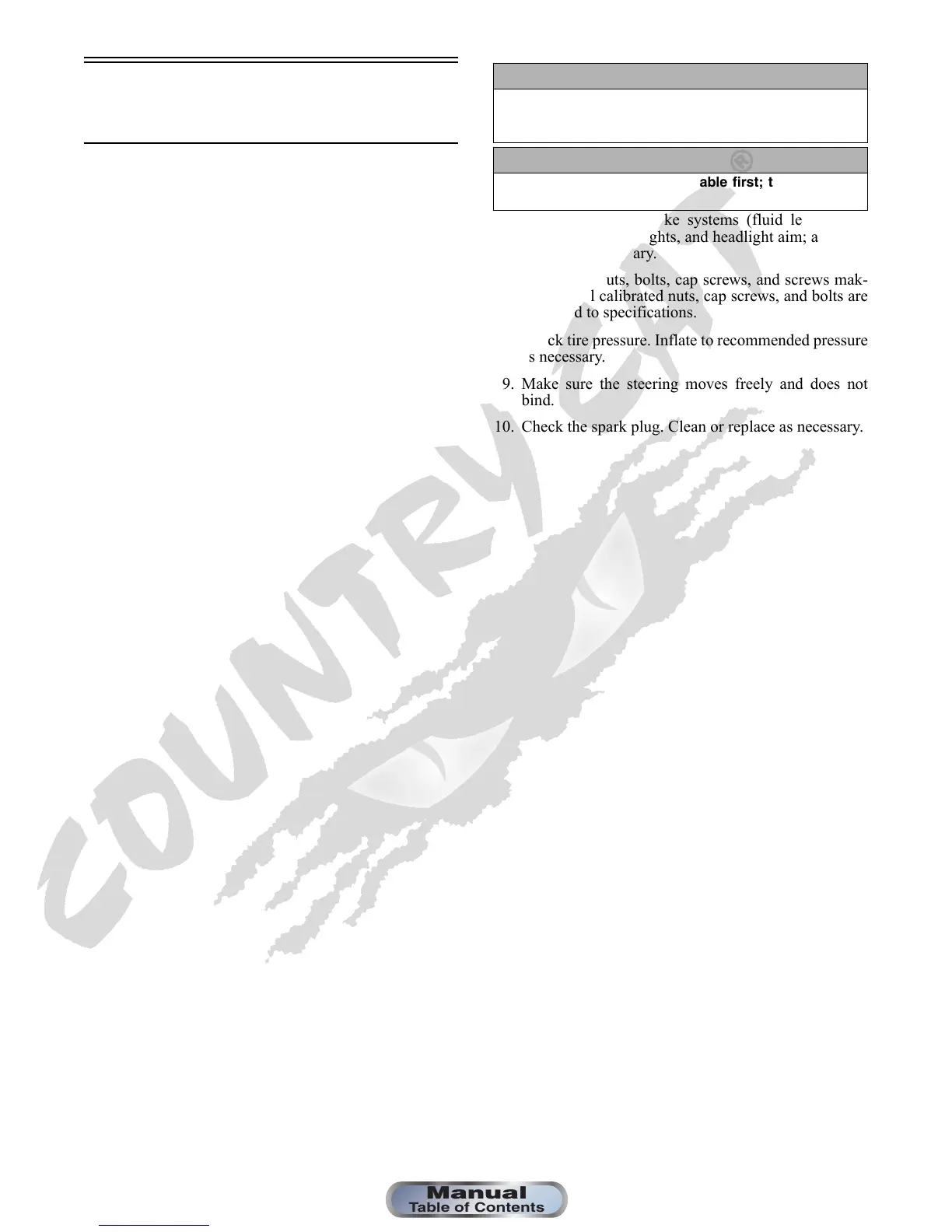 7. Tighten all nuts, bolts, cap screws, and screws mak-