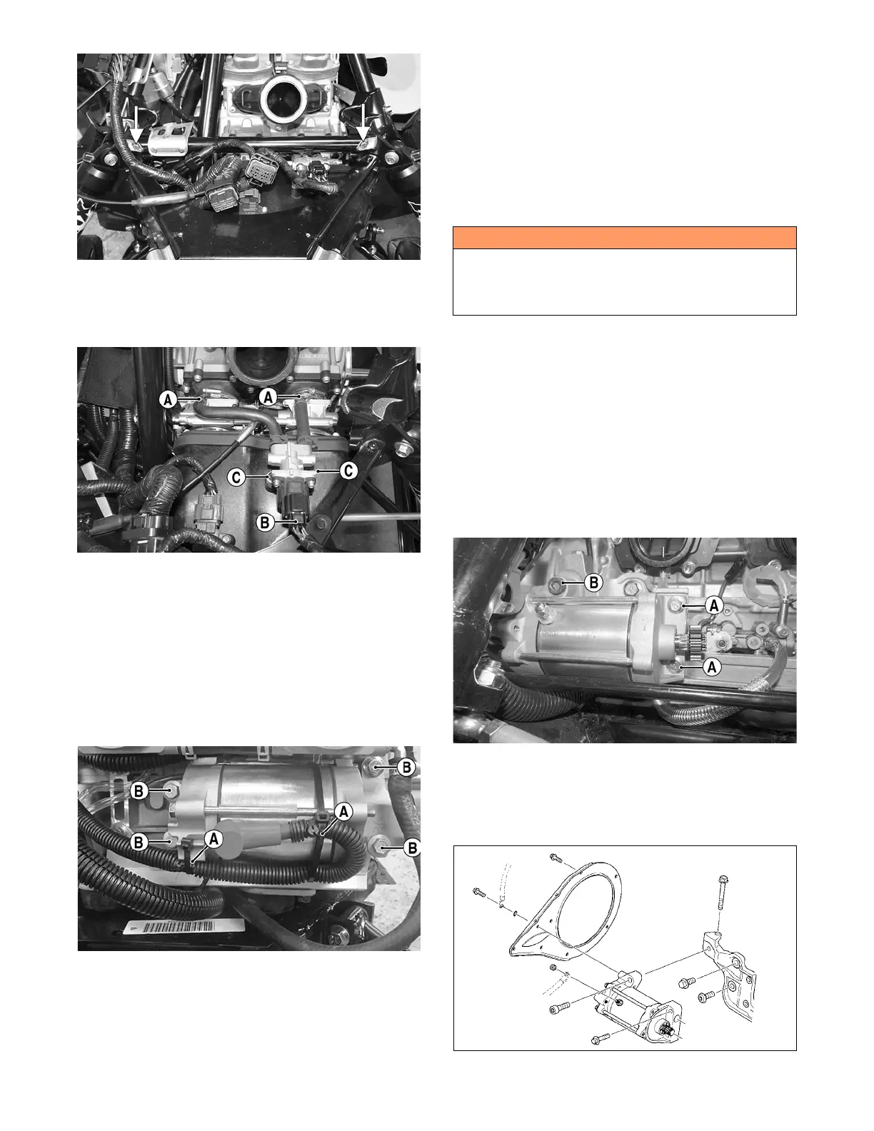 10. Remove the four cap screws (B) securing the starter
