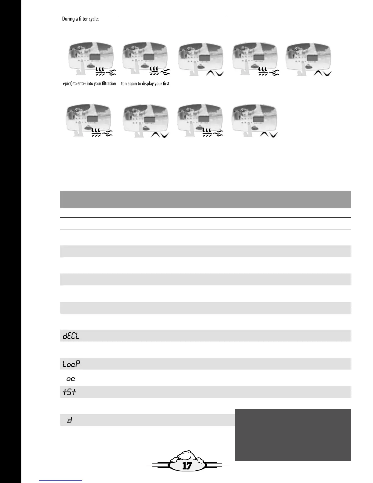 Please note: You will see the options that are applicable to your spa. If you have neither ozone nor onzen, you will proceed directly into setting your Filter