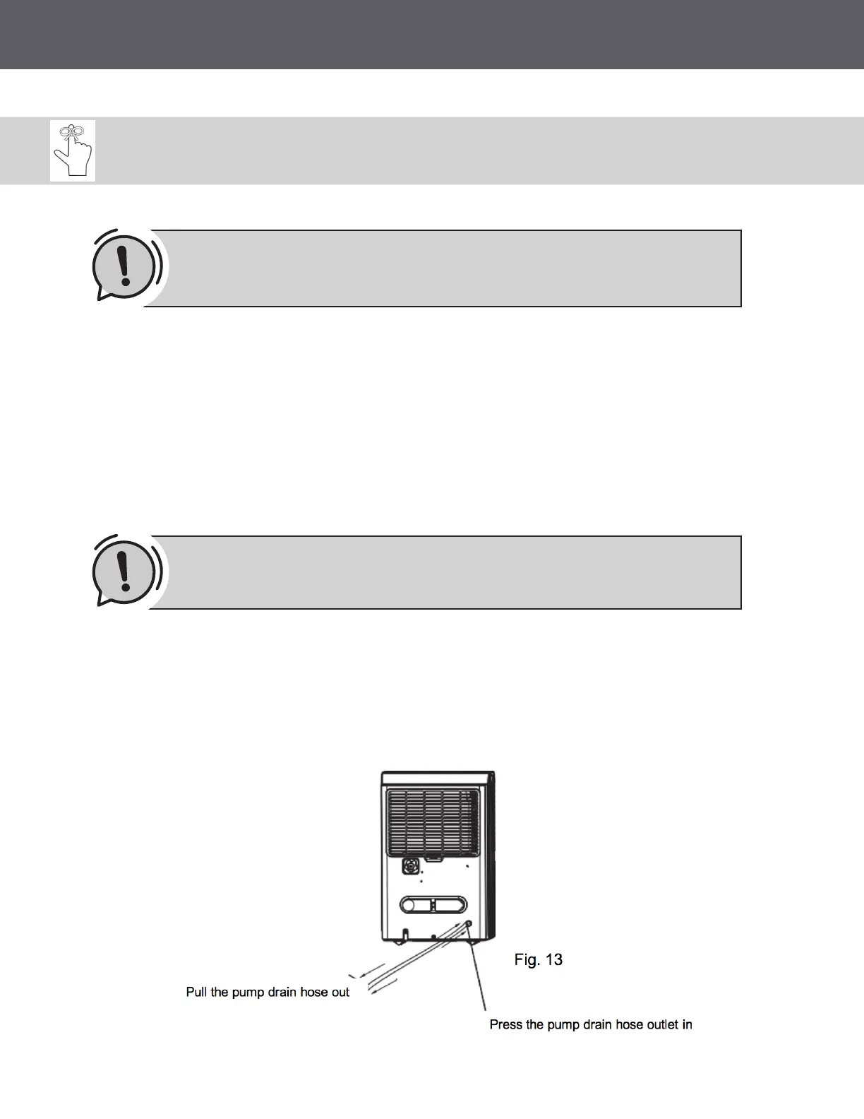• Press the pump drain hose outlet in towards the unit and pull the drain hose out (See Fig.13).