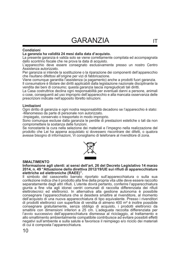 Per garanzia si intende la sostituzione o la riparazione dei componenti dell’apparecchio
