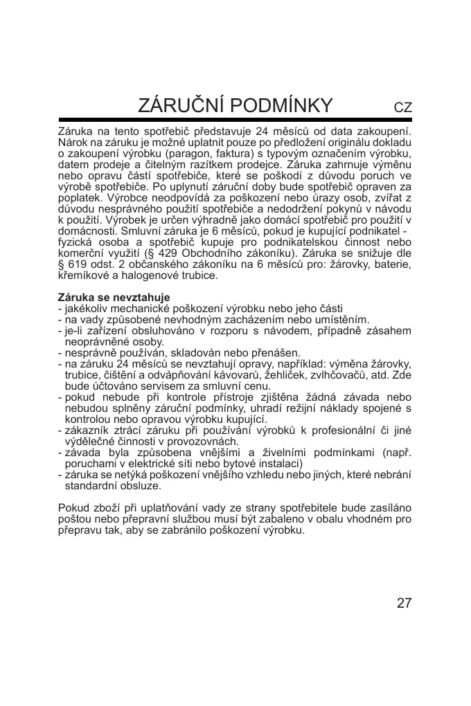 Záruka na tento spotřebič představuje 24 měsíců od data zakoupení.