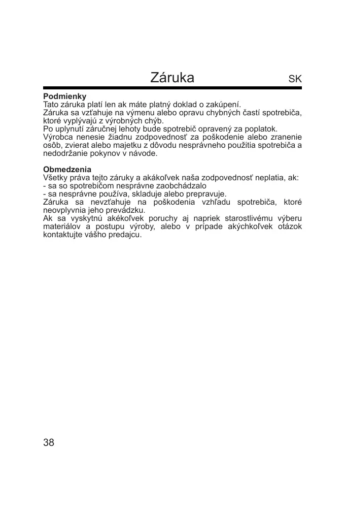 Záruka sa vzťahuje na výmenu alebo opravu chybných častí spotrebiča,