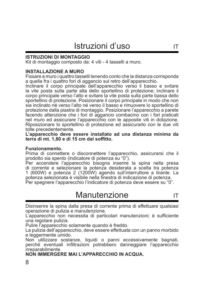 NON IMMERGERE MAI L’APPARECCHIO IN ACQUA.