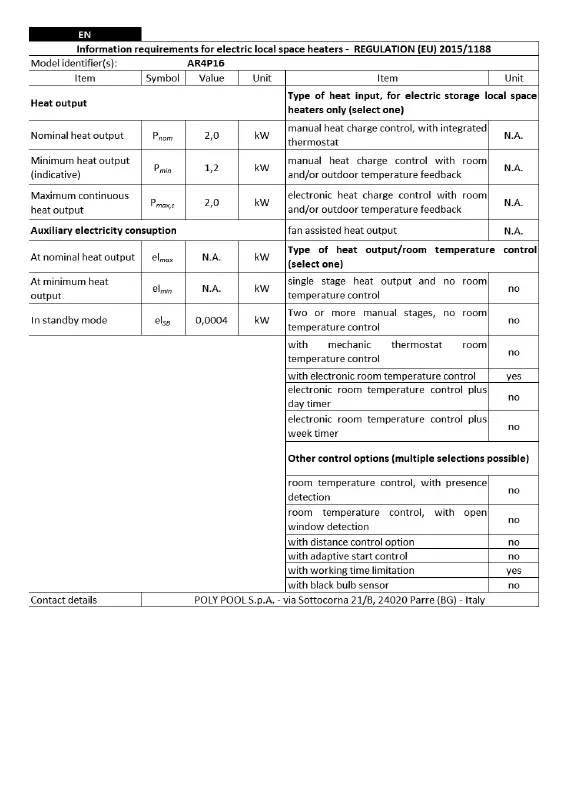ARDES AR4P16 - Technical Data and Compliance; Heat Output Specifications; Room Temperature Control Options