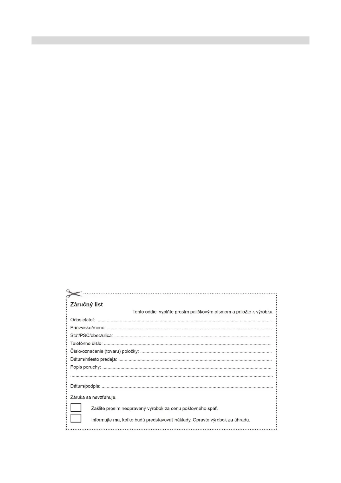 dátumom predaja a čitateľnou pečiatkou predajcu. Záruka zahŕňa výmenu alebo opravu častí spotrebiča, ktoré