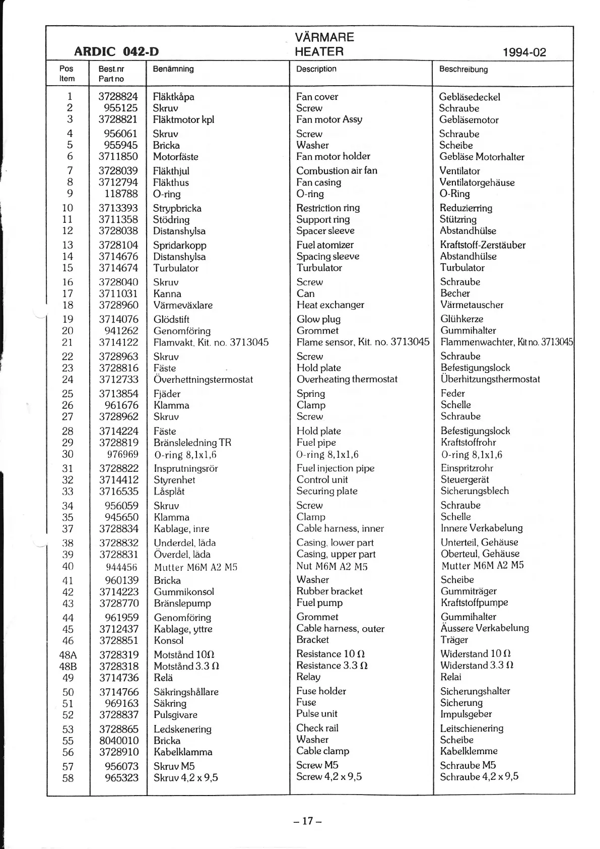 Ardic 042-D - Part List and Descriptions; Part Number and Description (Swedish); Part Number and Description (English); Part Number and Description (German)
