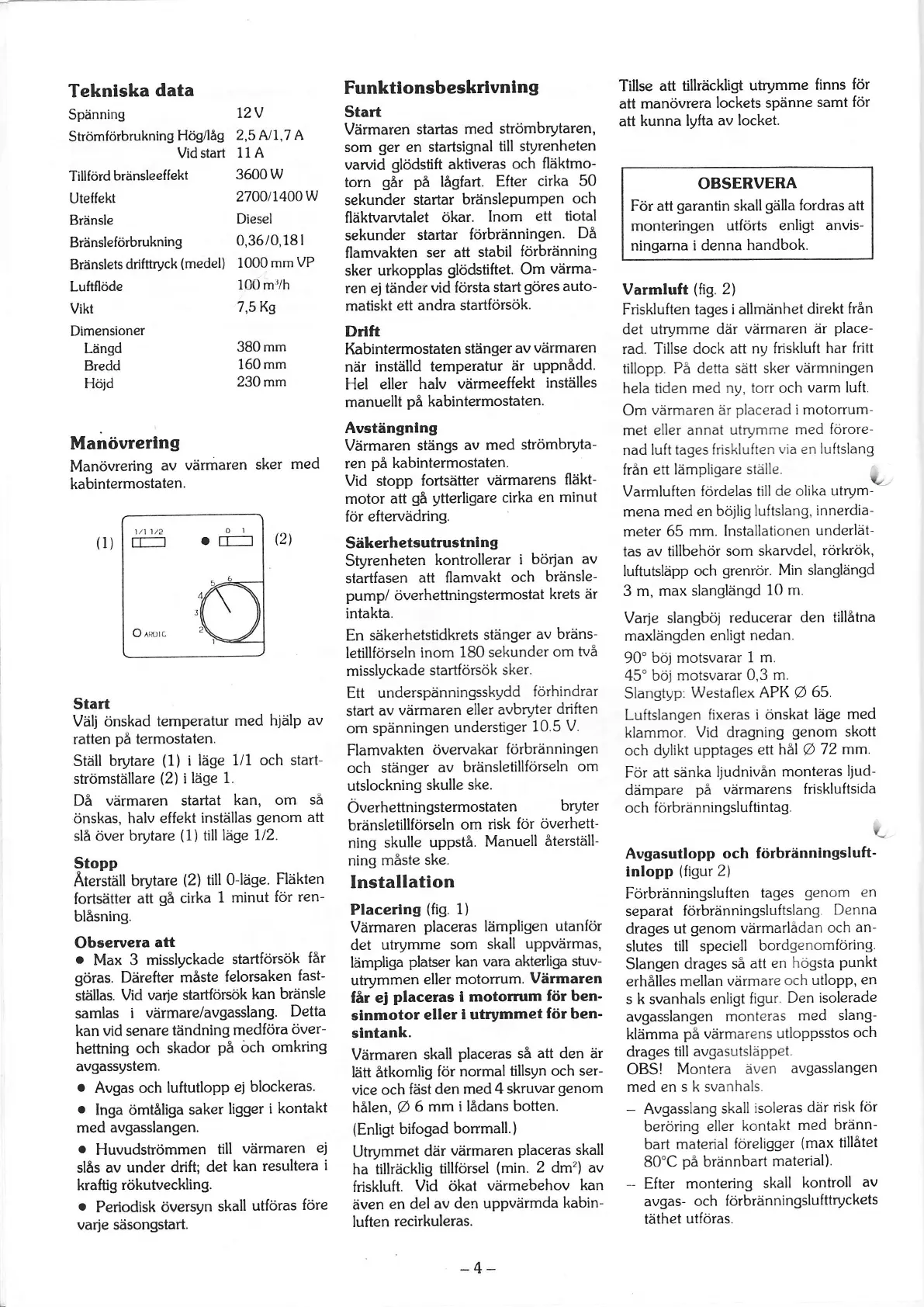 Ardic 042-D - Technical Specifications (Swedish); Heater Operation (Swedish); Starting the Heater (Swedish); Stopping the Heater (Swedish)