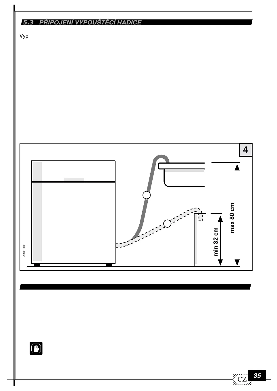 - Konec vypouštěcí hadice musí být ve srovnání s instalační plochou myčky (obr. 4) ve výšce mezi 32 a
