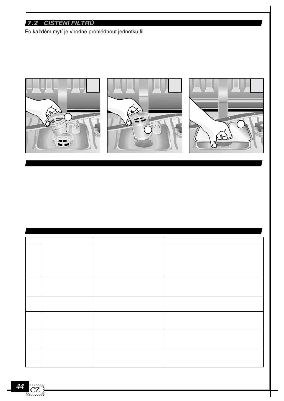 Všechny části omyjte pod tekoucí vodou. Vyčistěte je pečlivě. S ucpanými filtry nemůže myčka fungovat.