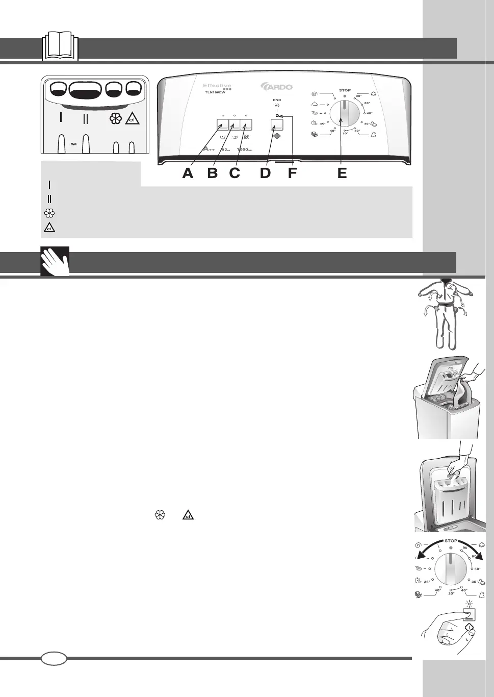 7. Sélectionnez le programme de lavage approprié au type de tissus en utilisant la manette E