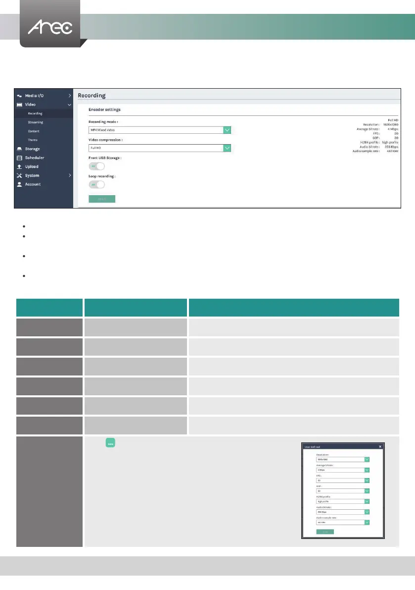 Video compression : There are 7 preset recording video compression proles for different resolution and bitrate. Select