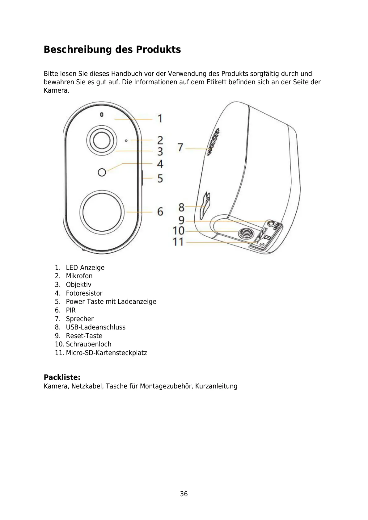 Kamera, Netzkabel, Tasche für Montagezubehör, Kurzanleitung