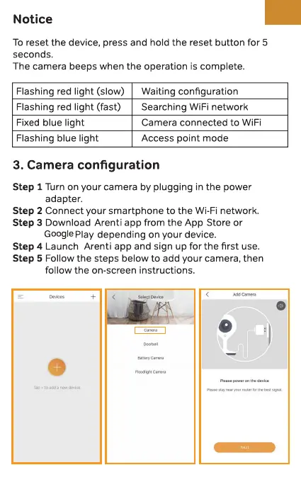 Arenti INDOOR 1 - Device Setup and Operation; Notice: Reset and Indicator Lights; Camera Configuration Steps