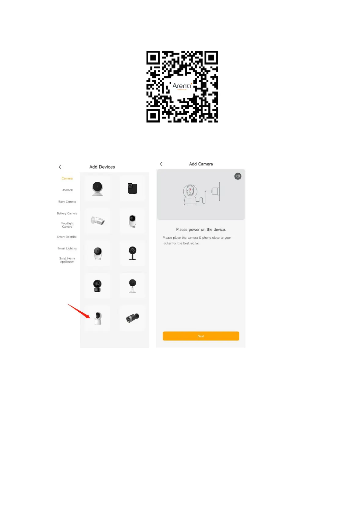 Open the Arenti APP home page, Click’+’ at the right top page. Follow the guide on the