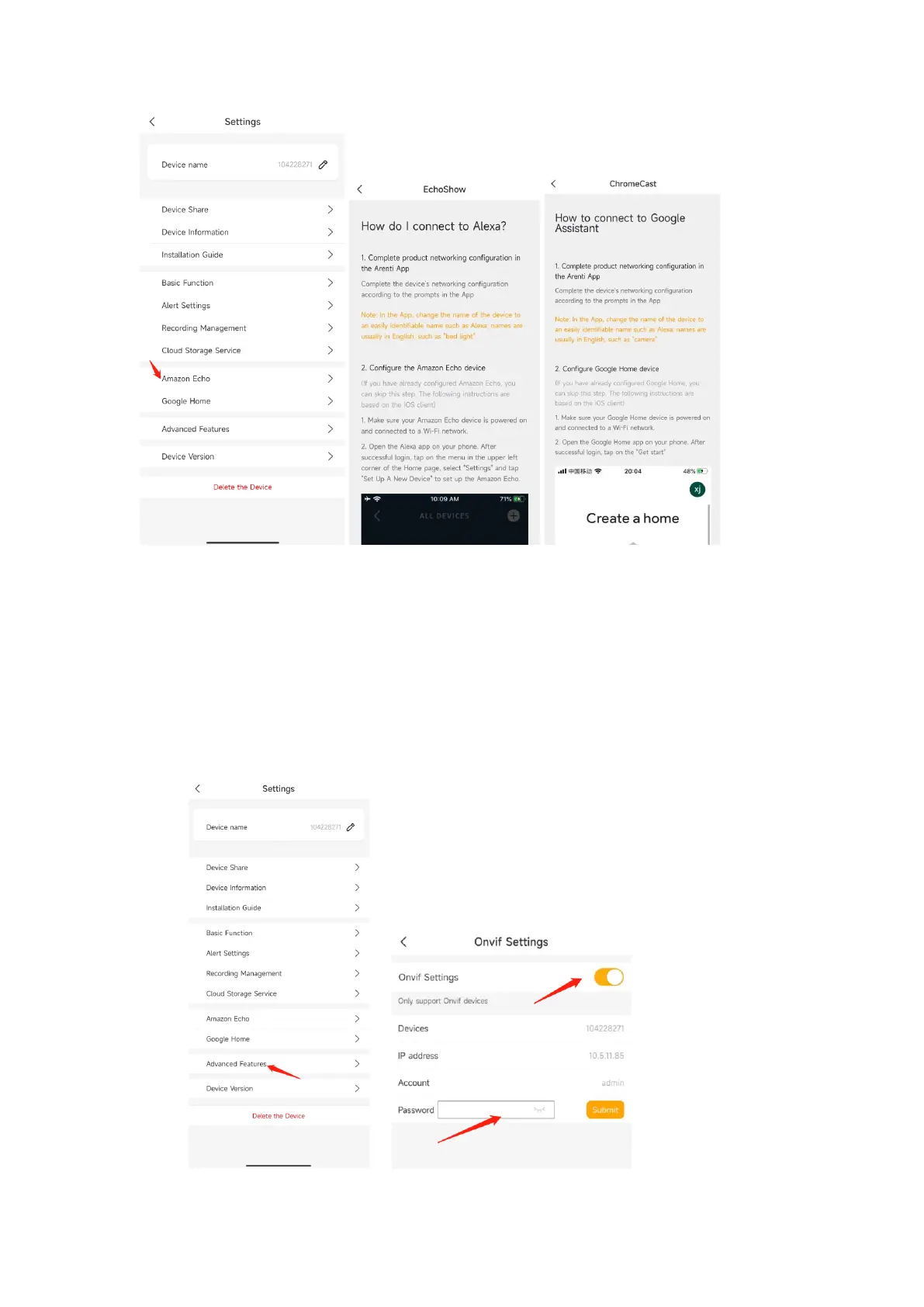 Tap Advanced Features-Onvif settings-enable ;set password and submit.