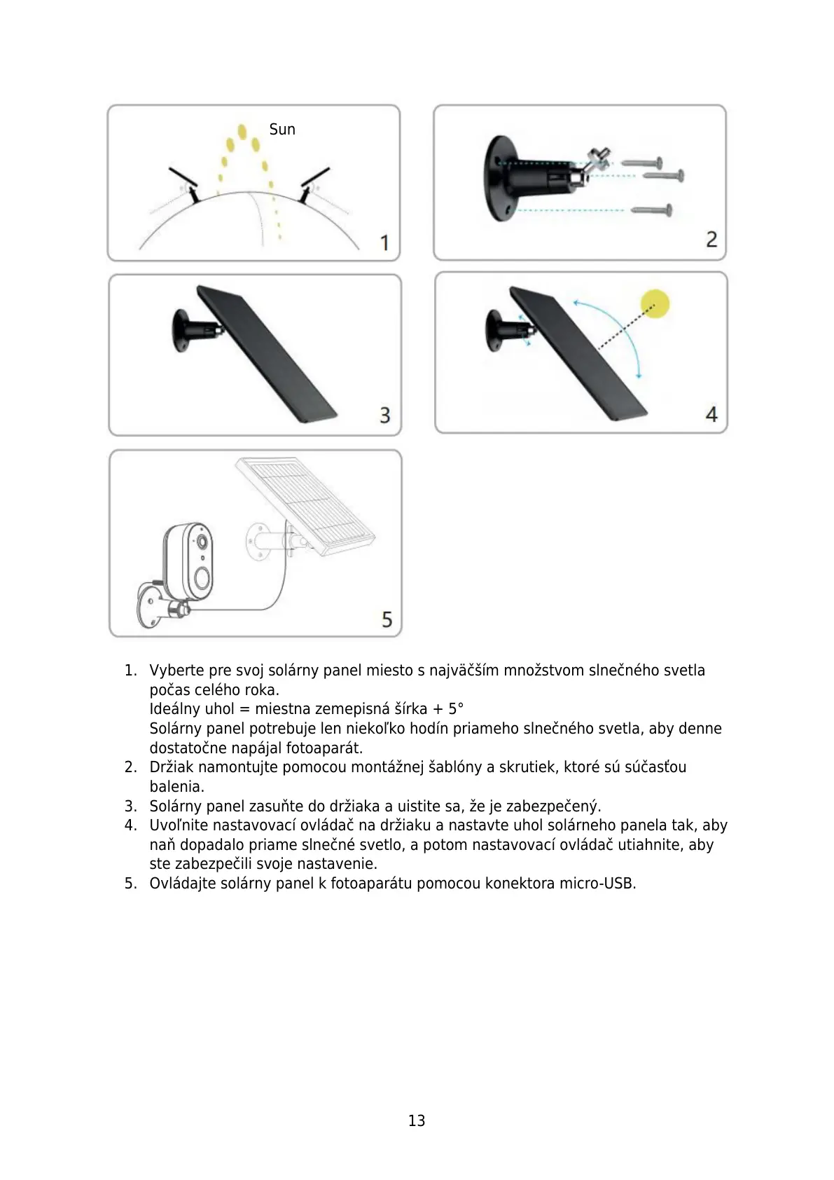 5. Ovládajte solárny panel k fotoaparátu pomocou konektora micro-USB.
