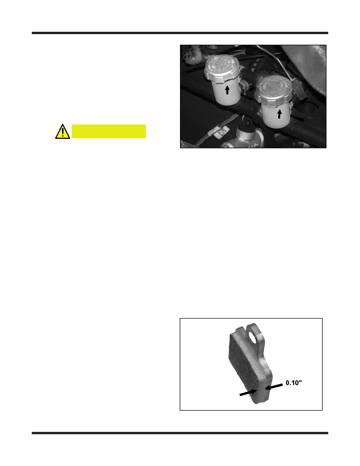 brake pads which are secured by a single bolt fastener. Inspect all 4 brake pads.