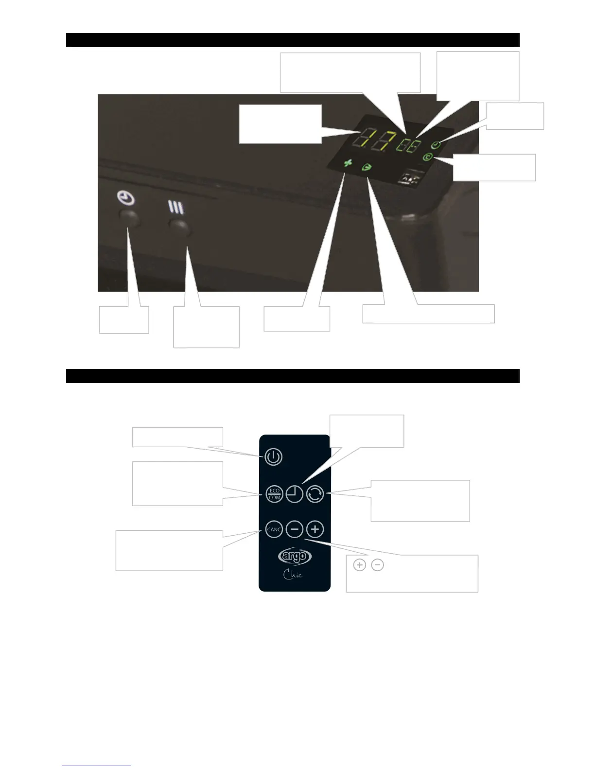 Argo Chic - CONTROLS AND REMOTE; Control Panel and LED Display; Remote Control Functions