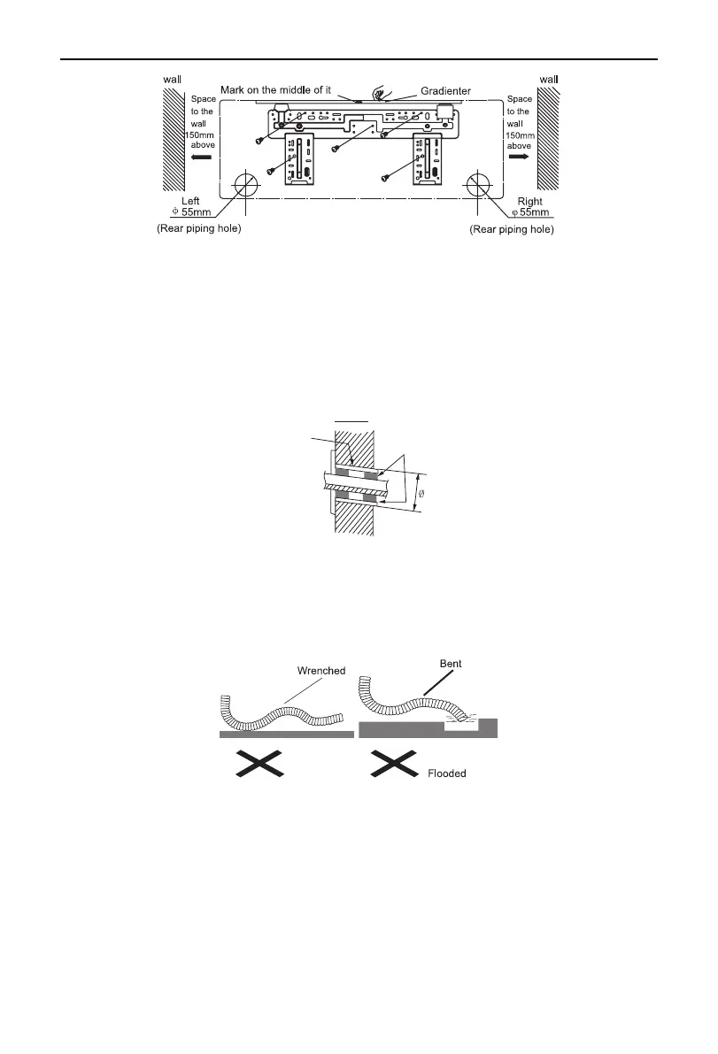 (1) Make the piping hole (Ф55) in the wall at a slight downward slant to the outdoor side.