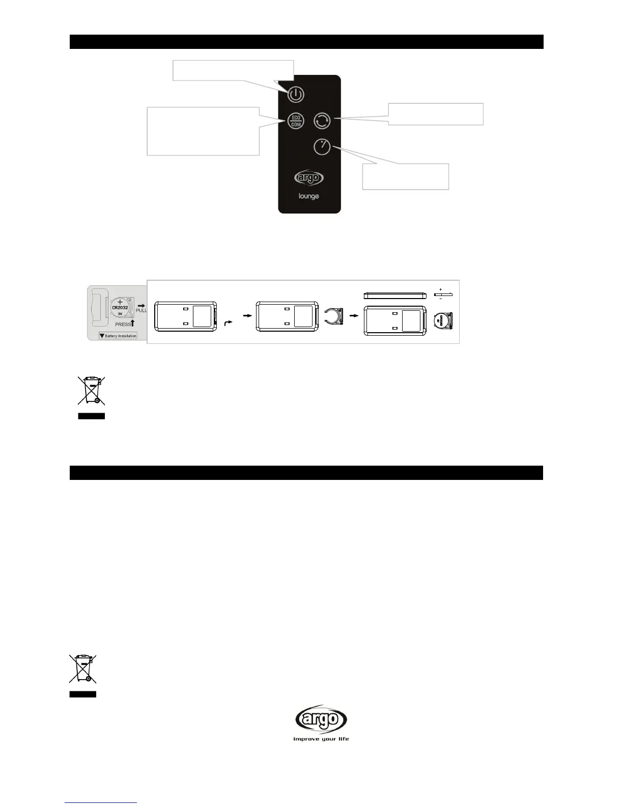 The remote control uses Lithium/Manganese button cells, model no. CR2032 -3 V, compliant with Battery Directive no.