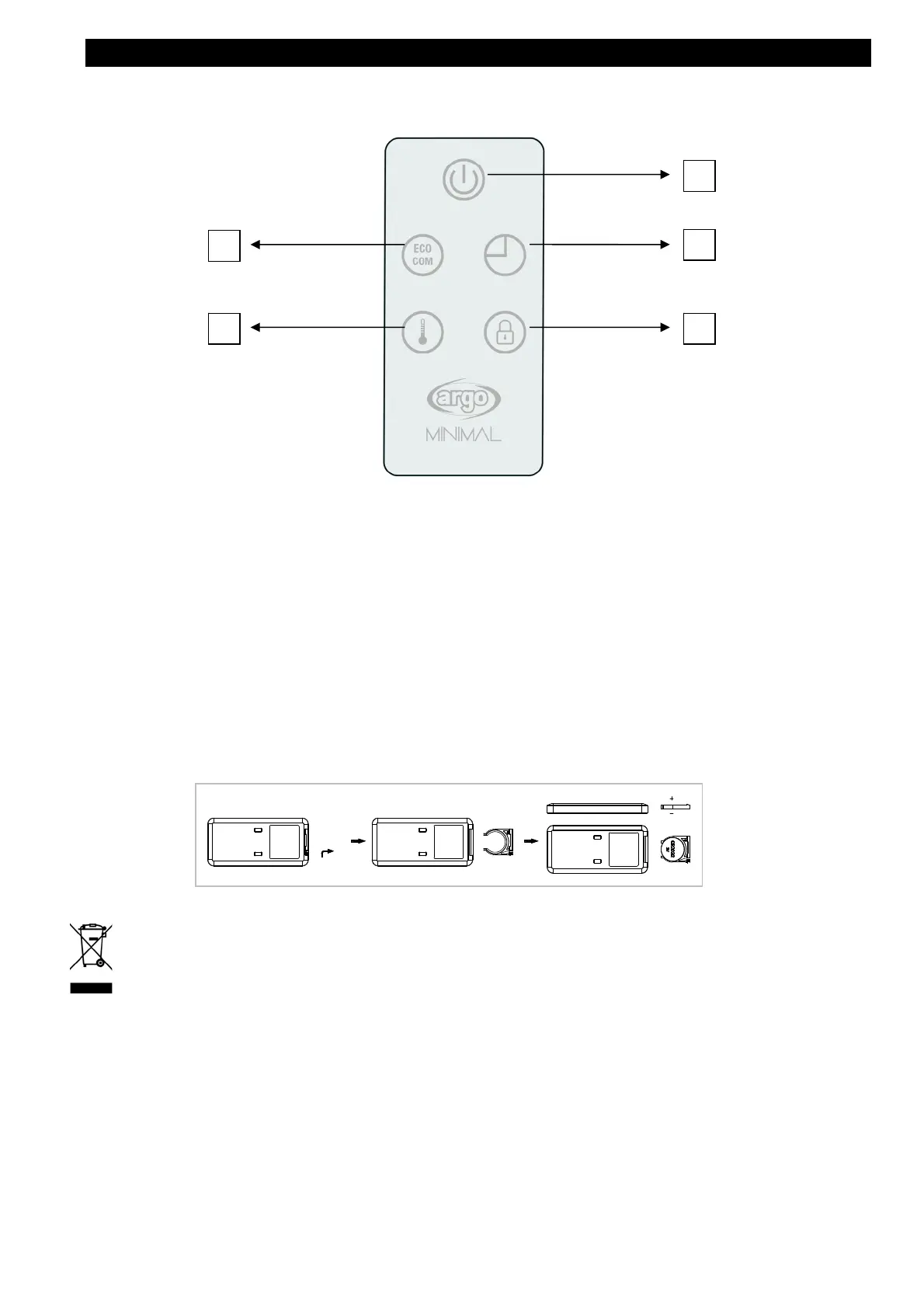 The remote control uses Lithium/Manganese button cells, model no. CR2025-3V, compliant with Battery Directive no.