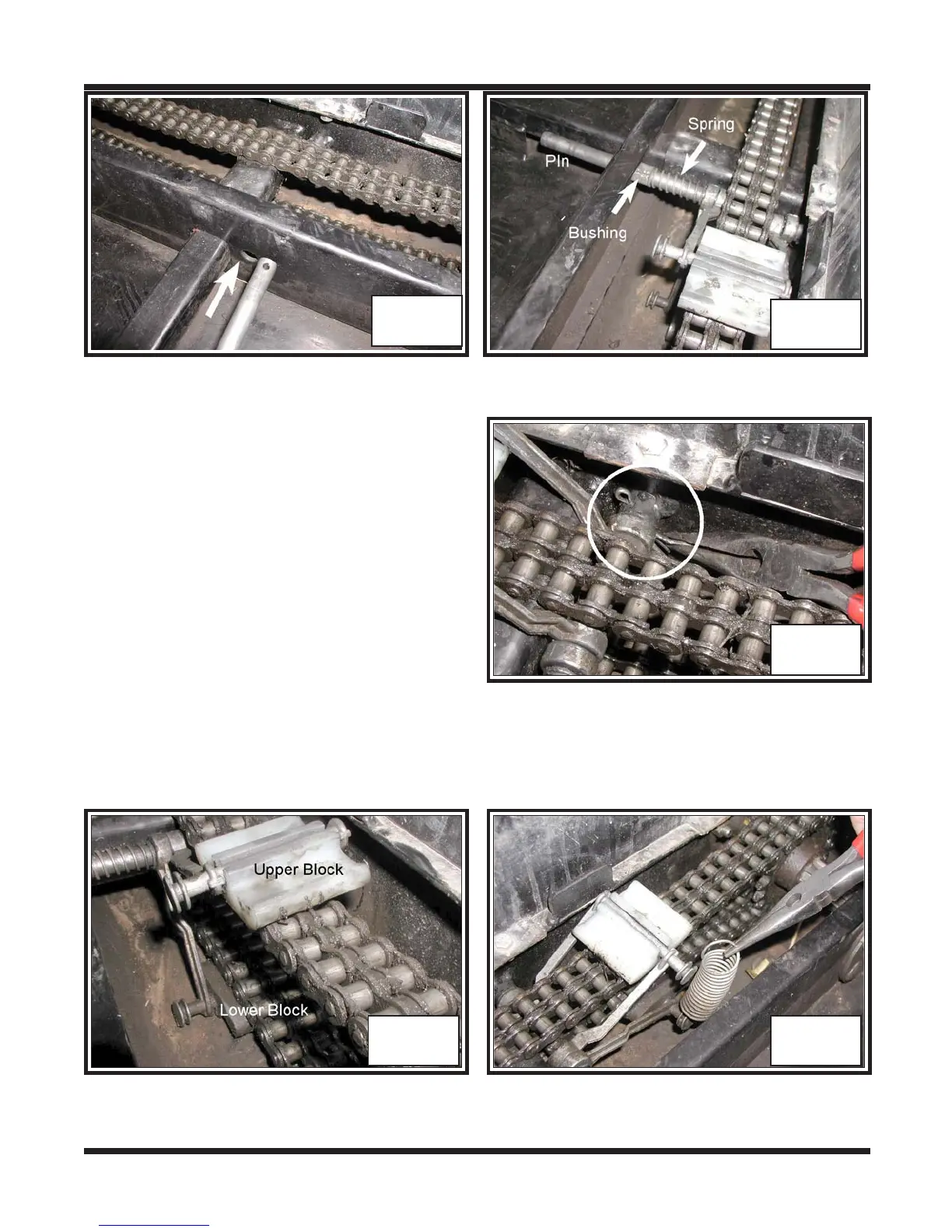 5. Place the bushing, spring, lower tensioner arm and upper tensioner arm on