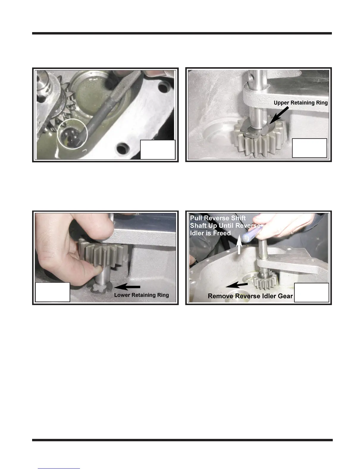 30. Raise the reverse idler up and remove the retaining ring found below. Photo TR-36