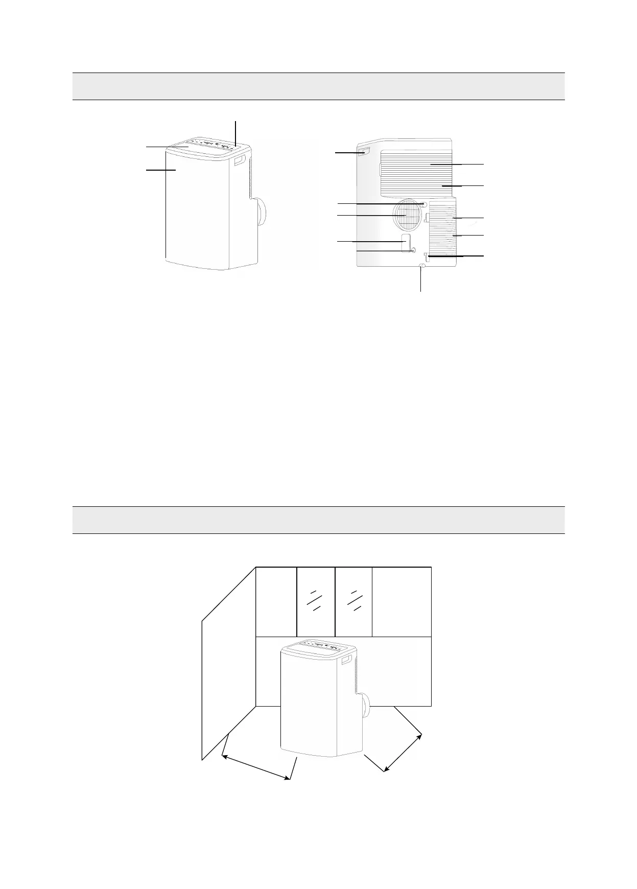 I seguenti spazi devono essere mantenuti per assicurare l’efcienza operativa del climatizzatore portatile.