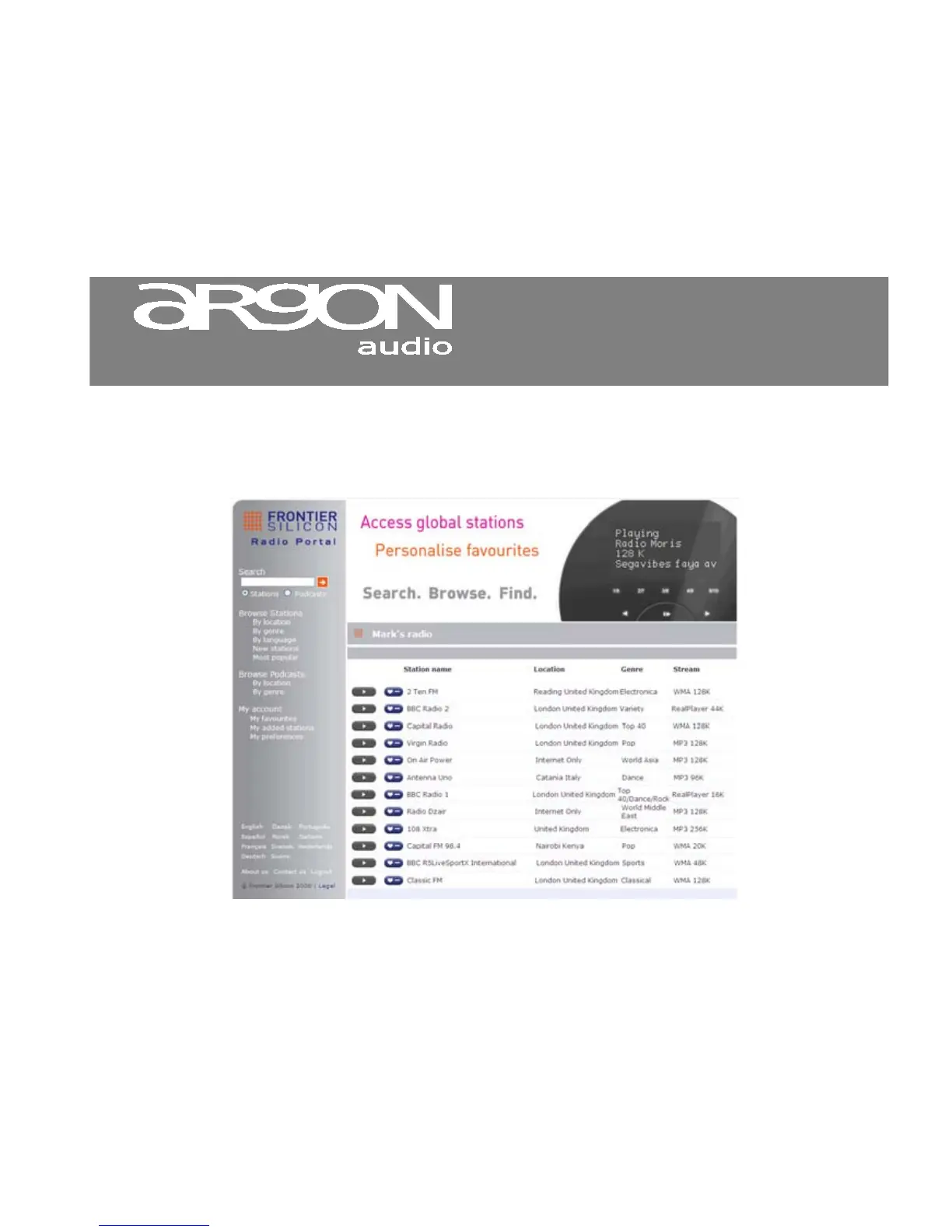 Argon Stream2 uses the Frontier Silicon Internet radio portal website that allows you to organise