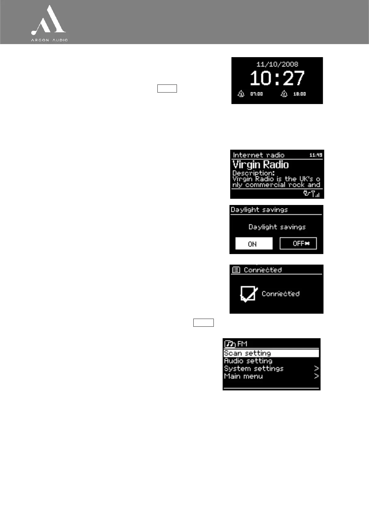 Dialogue screens mark the current setting with an