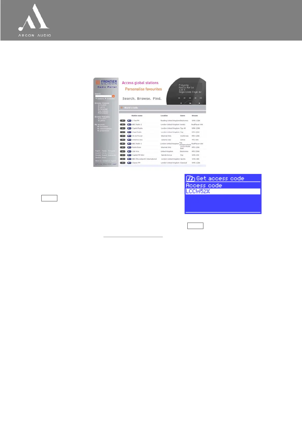 Argon Stream3M uses the Frontier Silicon Internet radio portal website that allows you to organise your