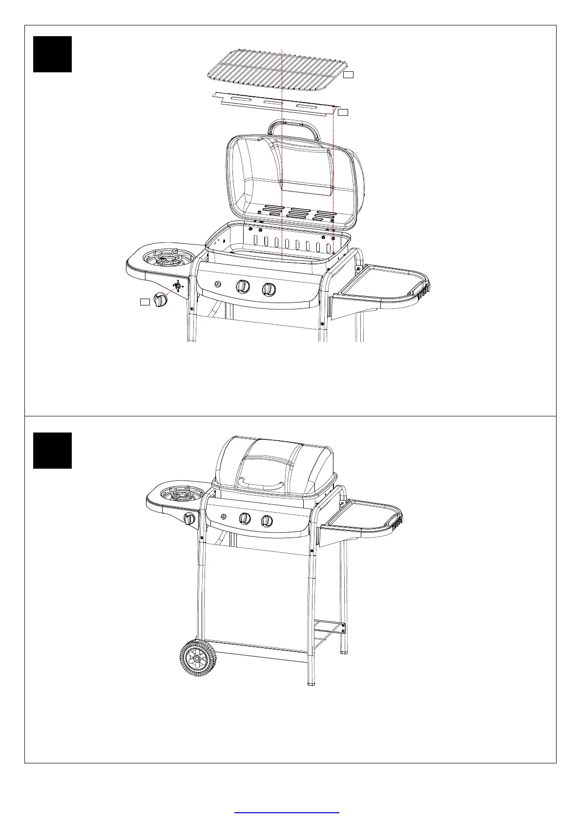 Put the side burner knob (D2) on the side burner assembly (D1). Put the heat tent (A4) and cooking grill