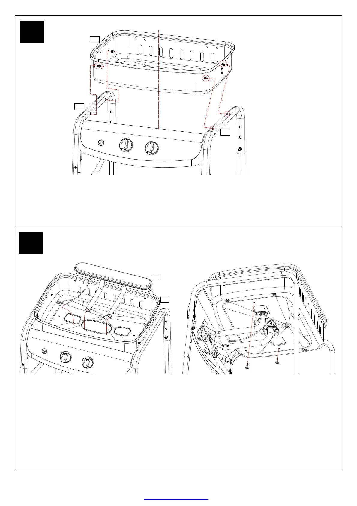 Set the firebowl (A7) on the left upper support (B6) and right upper support (B7) using M6*20 bolts (E1) as