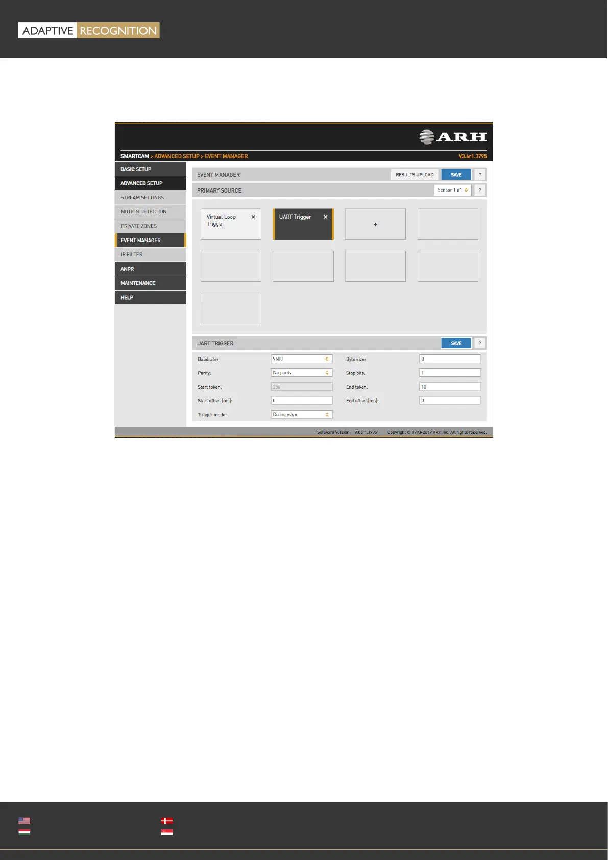 The camera can be triggered through its UART port. Besides the common UART properties (Baudrate,