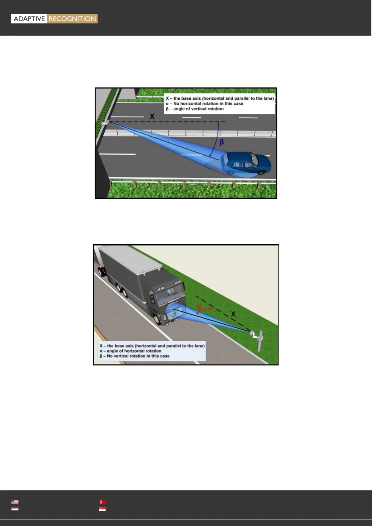 • Overhead, when the device is installed above the lane (approx. 5-6 meters high), and in the