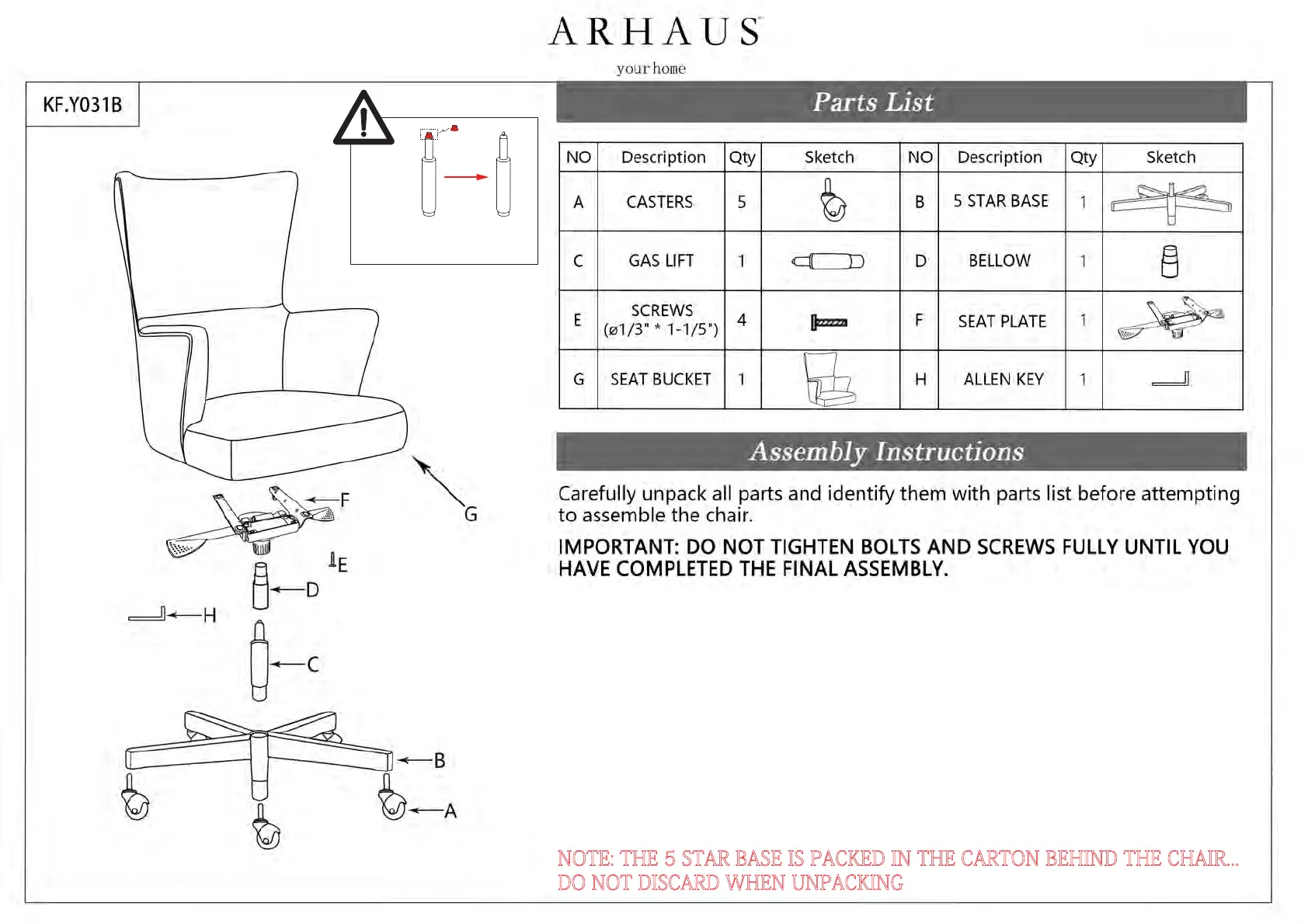 NOTE: THE 5 STAR BASE IS PACKED IN THE CARTON BEHIND THE CHAIR...
