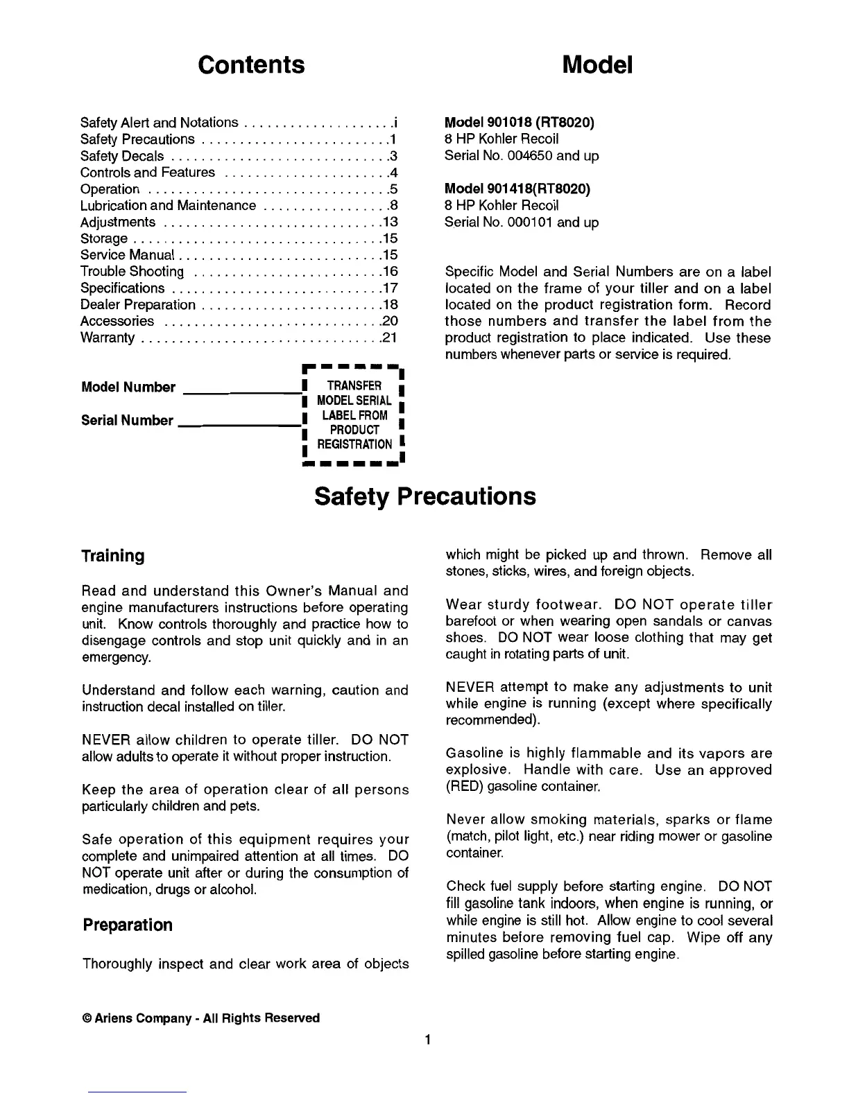 Ariens 901018 - Contents; Safety Precautions; Training; Preparation