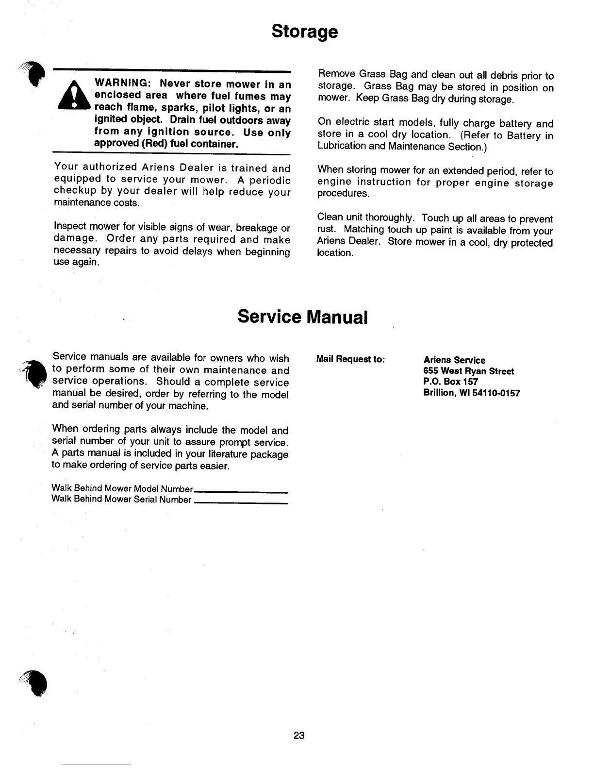 Ariens 911 - Storage