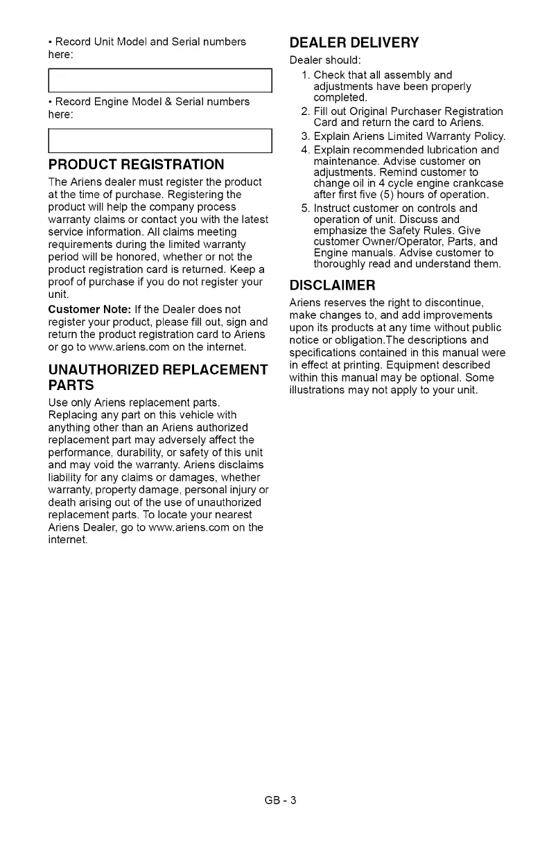 3. Explain Ariens Limited Warranty Policy.
