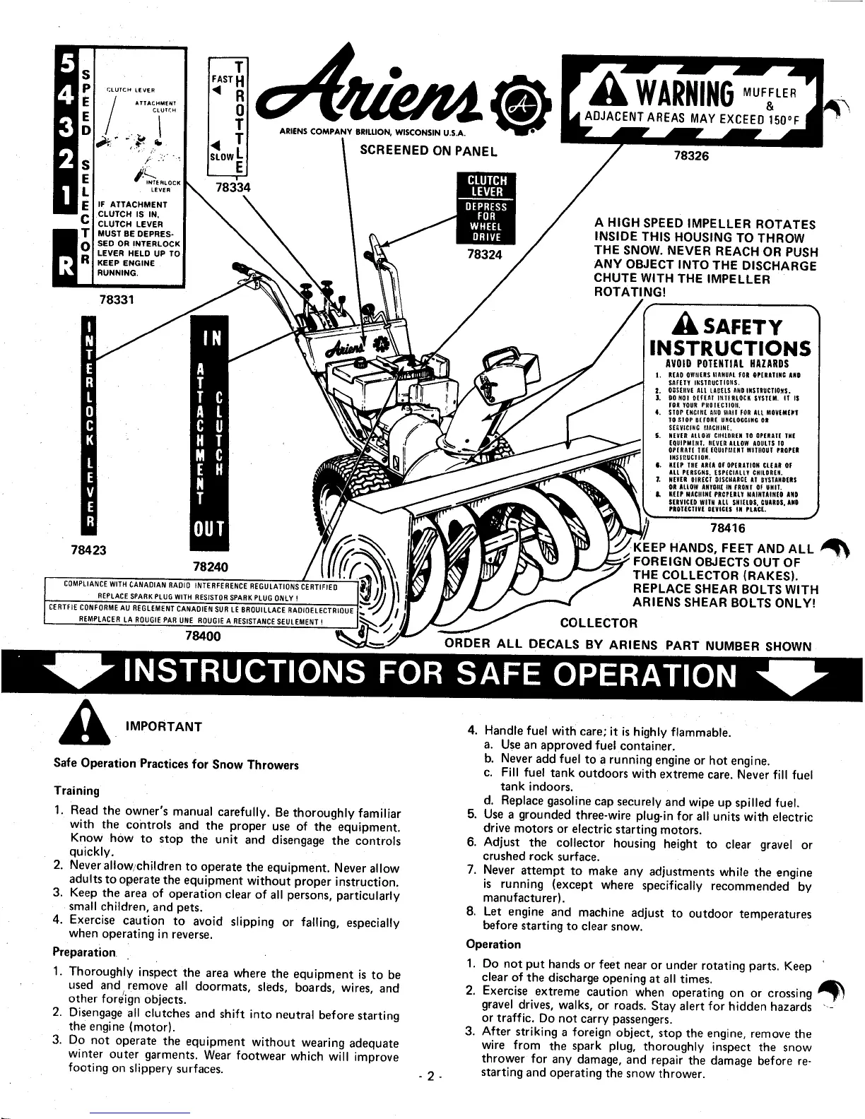 Ariens 924027 - Instructions for Safe Operation; Training; Preparation; Operation