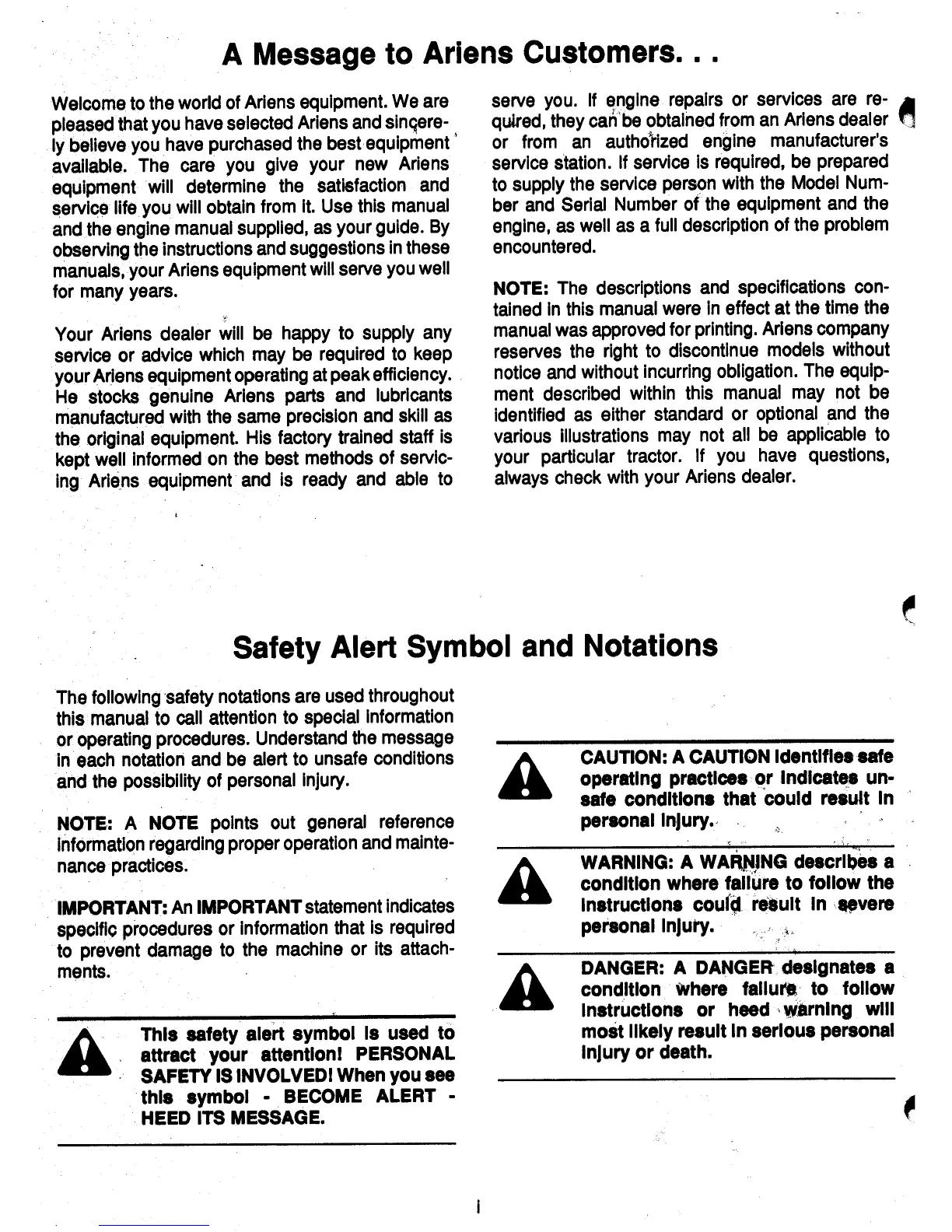 Ariens 931033 - A Message to Ariens Customers; Safety Alert Symbol and Notations