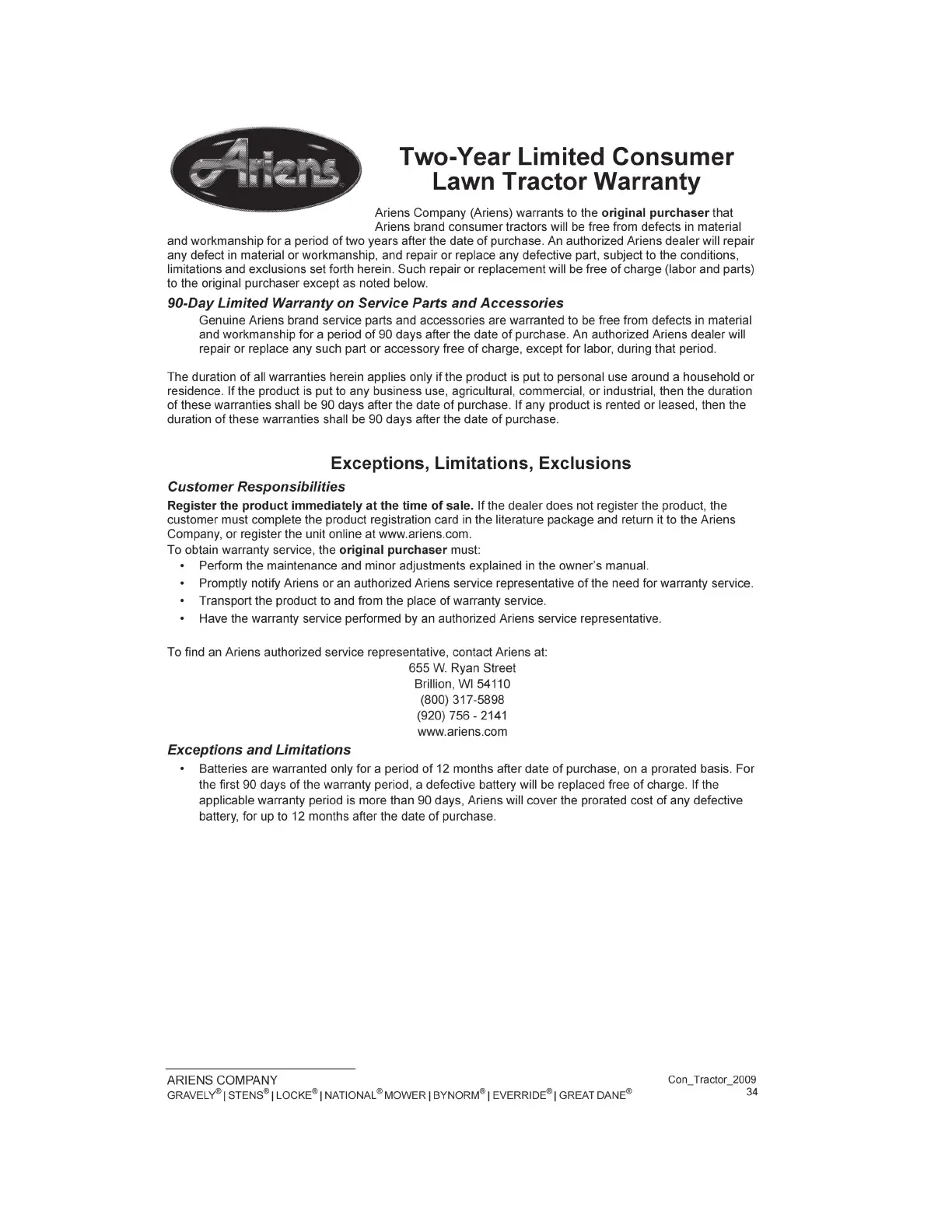 Ariens 936039 - Warranty