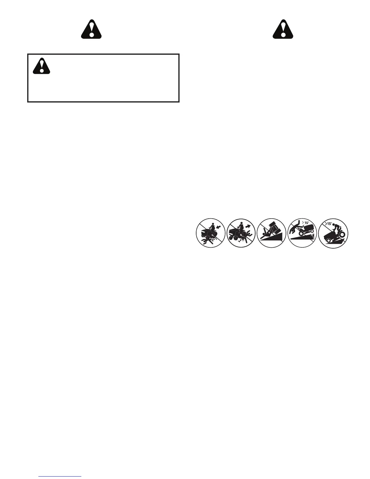 • Avoid starting, stopping, or turning on a slope. If the tires