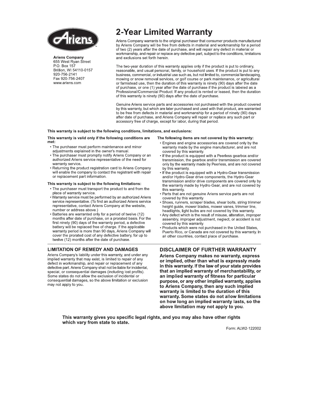 Ariens ST622 - SPECIFICATIONS AND WARRANTY; TECHNICAL SPECIFICATIONS; WARRANTY COVERAGE AND CONDITIONS