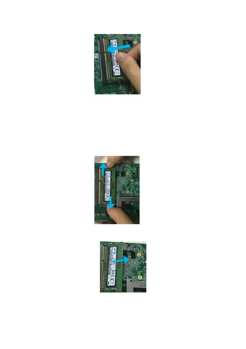 2. Insert the DIMM into the slot at 45-degree angle, then push it in until the golden
