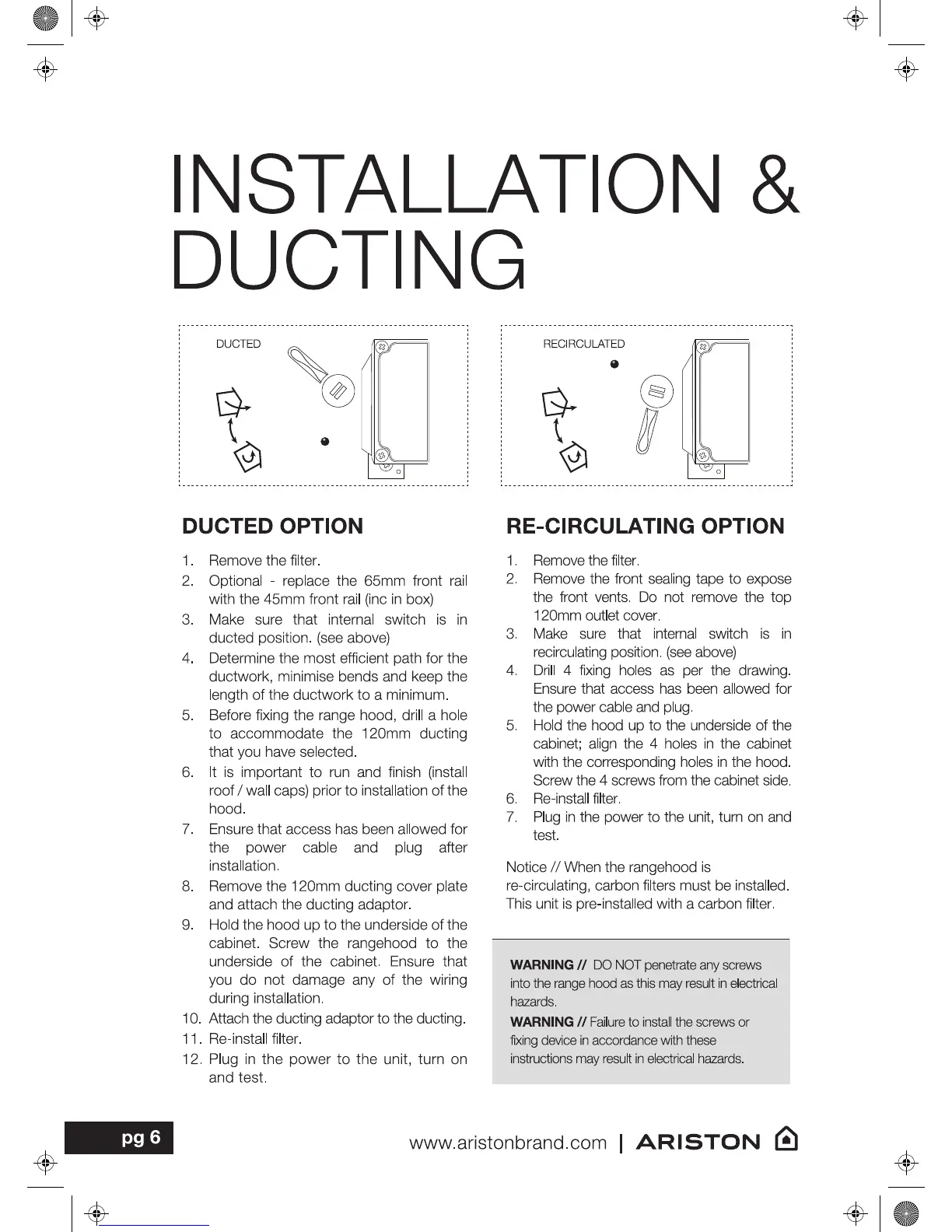 Ariston ARH6SIX - Ducted and Recirculating Installation; Installation Safety Precautions