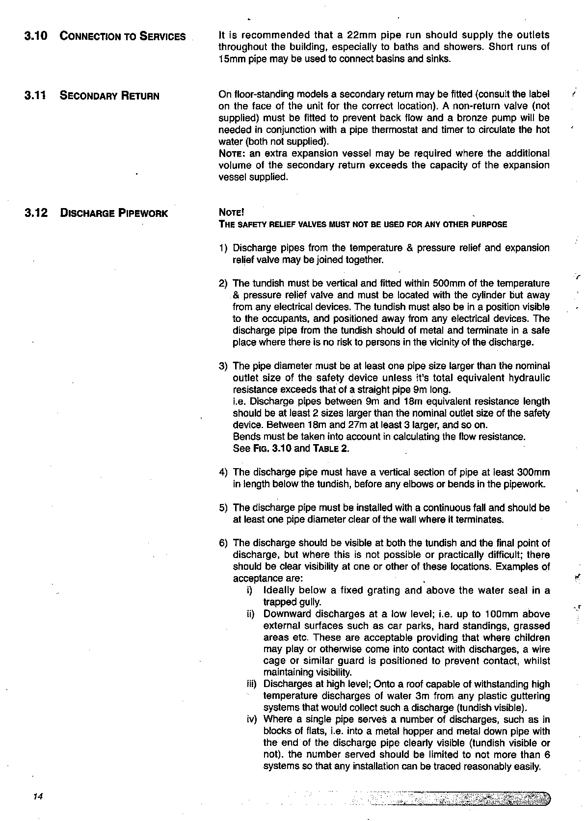 Ariston Classico HE STD 125 - 3.10 Connection to Services; 3.11 Secondary Return; 3.12 Discharge Pipework